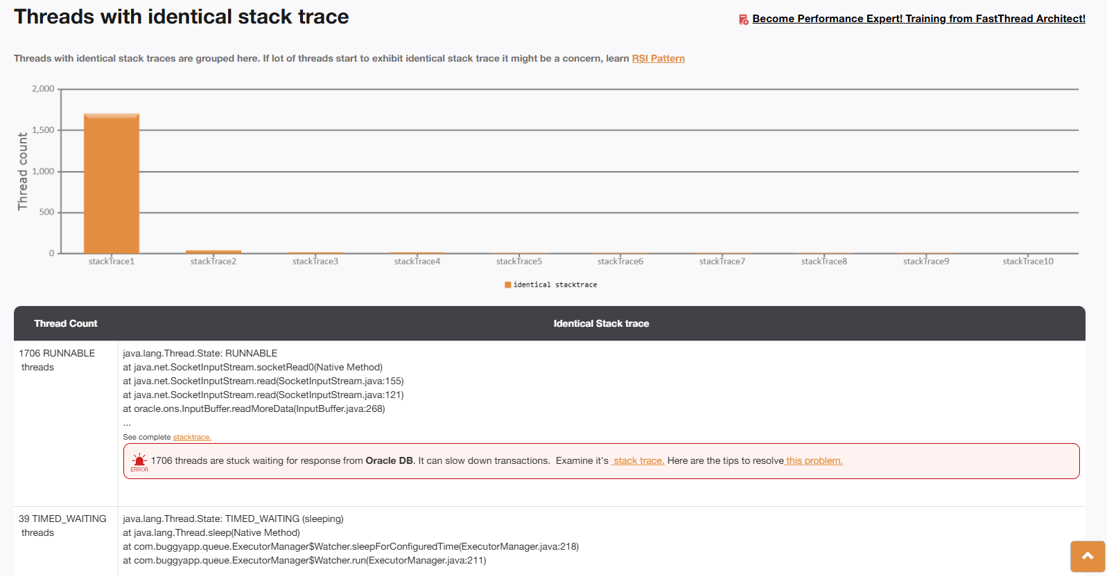 Upon examining the fastThread analysis, the tool highlighted the stack traces of the 1,706 repeating threads. These stack traces clearly indicated that the threads were originating from the Oracle JDBC driver. The application had enabled the ‘Online Notification Service’ (ONS) flag, a feature recommended by Oracle to improve availability. However, due to a bug in the JDBC driver, each backend call was spawning a new thread that never terminated. Over time, these excessive threads accumulated, eventually overwhelming the JVM and causing the application to become unresponsive.
