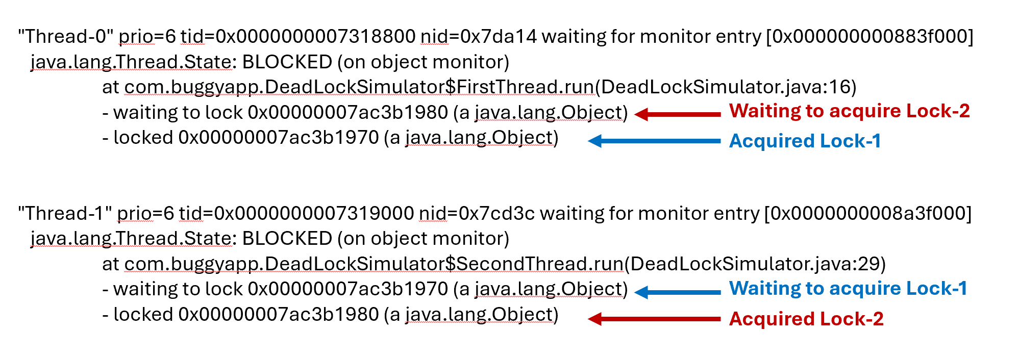 - While Thread-1 has already acquired lock 0x00000007ac3b1980 (Lock-2) and is waiting for lock 0x00000007ac3b1970 (Lock-1), creating a circular dependency.